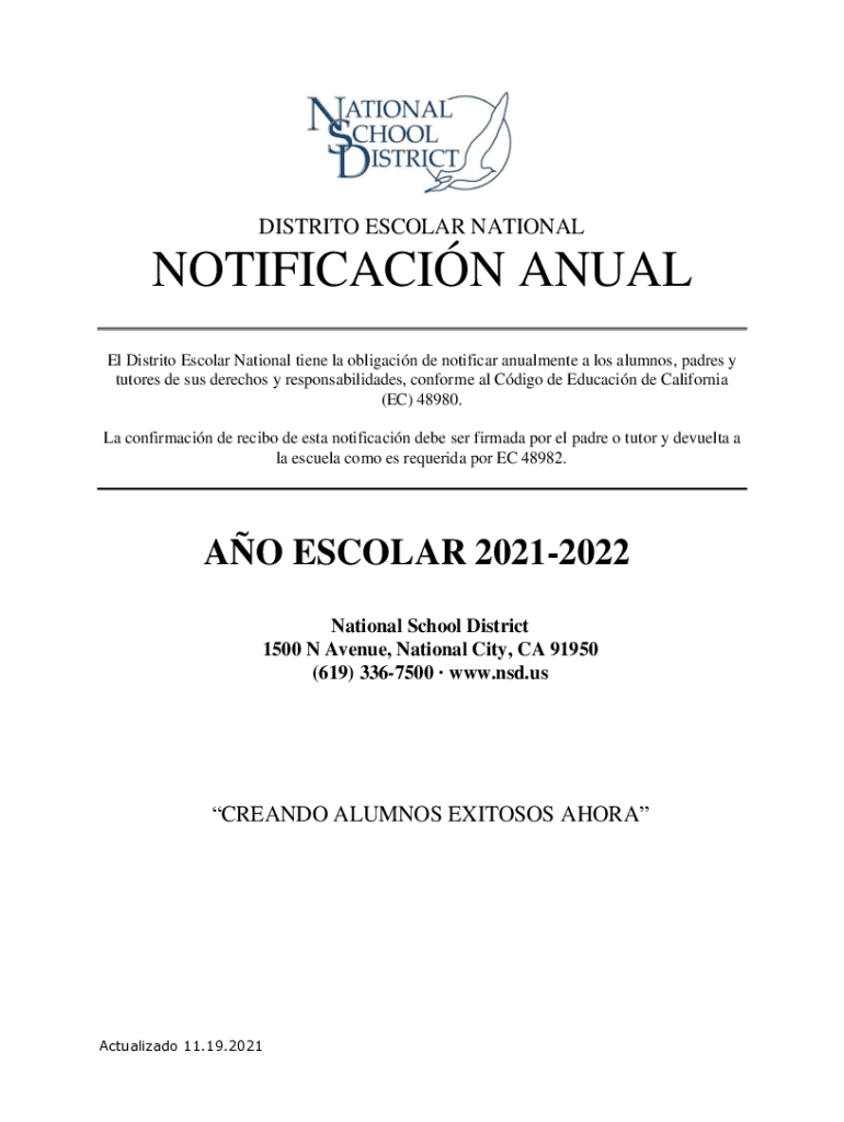 TONAL POOL DISTRICT ESCOLAR NATIONALNOTIFICACIN ANNUAL El District Escolar National Taine la obligation DE notifier annulment a Los alumnus, padres y tutors DE SUS searches y responsabilidades, conform