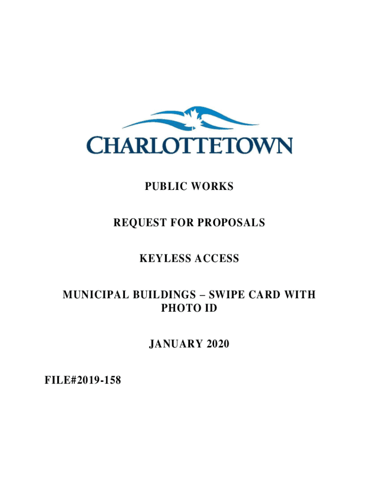 PUBLIC WORKS REQUEST FOR PROPOSALS KEYLESS ACCESS MUNICIPAL BUILDINGS SWIPE CARD WITH PHOTO ID JANUARY 2020 FILE×2019158TABLE OF CONTENTS TABLE OF CONTENTS ...........................................................................................................................