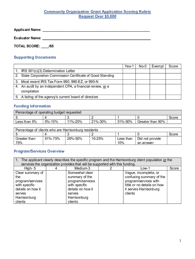 Community Organization Grant Application Scoring Rubric Request Over $5,000 Applicant Names: ___ Evaluator Name: ___ TOTAL SCORE: ___/65Supporting Documents 1. IRS 501×c)(3) Determination Letter