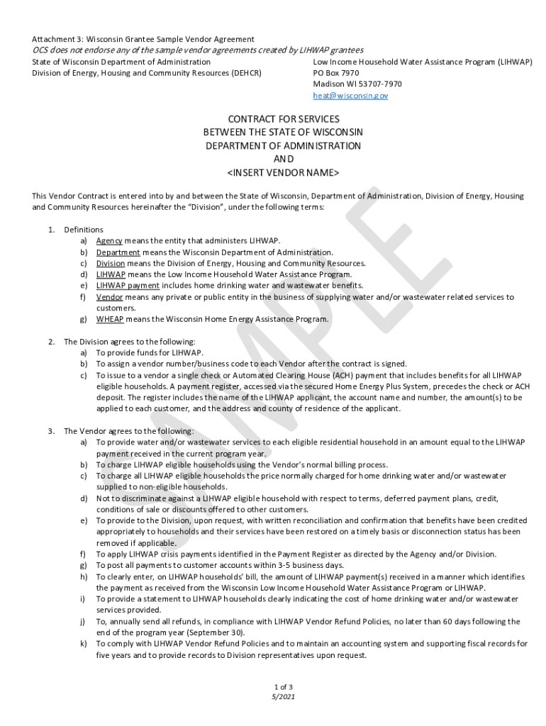 Attachment 3: Wisconsin Grantee Sample Vendor Agreement OCS does not endorse any of the sample vendor agreements created by LIH WAP grantees State of Wisconsin Department of Administration Division