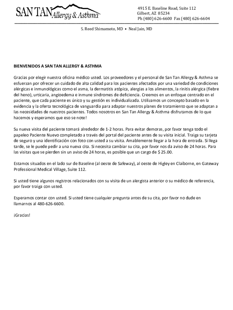 4915 E. Baseline Road, Suite 112 Gilbert, AZ 85234 pH (480× 6266600 Fax (480× 6266604 S. Reed Minamoto, MD Neal Jain, MDBIENVENIDOS A SAN TAN ALLERGY & ASTHMA Gracias POR elegy Questran official
