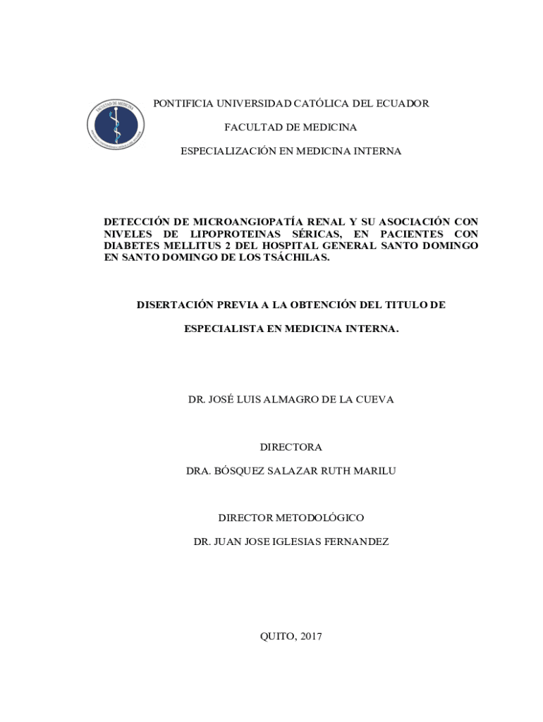 PONTIFICAL UNIVERSITY CATALINA DEL ECUADOR FACULTY DE MEDICINE SPECIALIZATION EN MEDICINE INTERNADETECCIN DE MICROANGIOPATA RENAL Y SU ASSOCIATION CON NOVELS DE LIPOPROTEINS PRICES, EN PATIENTS CON