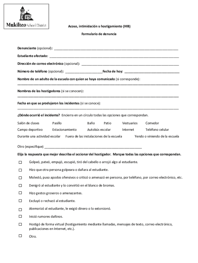 Across, intimidating u hostigamiento (HIS) Formulation de denunciaDenunciante (optional): ___ Estudiante affected: ___ Direction DE core electric (optional): ___ Nero de Teflon (optional): ___Tech