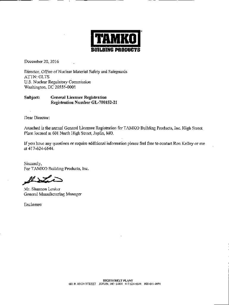 Tamil BUILDING PRODUCTS December 20, 2016, Director, Office of Nuclear Material Safety and Safeguarding: GETS U.S. Nuclear Regulatory Commission Washington, DC 205550001 Subject:General Licensee Registration