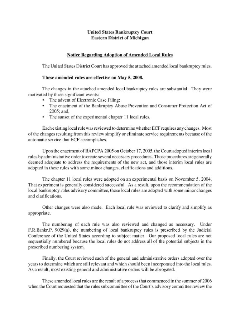 United States Bankruptcy Court Eastern District of MichiganNotice Regarding Adoption of Amended Local Rules The United States District Court has approved the attached amended local bankruptcy rules.
