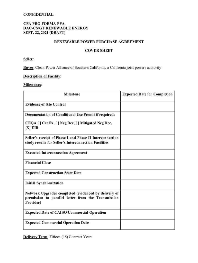 CONFIDENTIAL CPA PRO FORMA PPA DACES×GT RENEWABLE ENERGY SEPT. 22, 2021 (DRAFT) RENEWABLE POWER PURCHASE AGREEMENT COVER SHEET Seller: Buyer: Clean Power Alliance of Southern California, a California