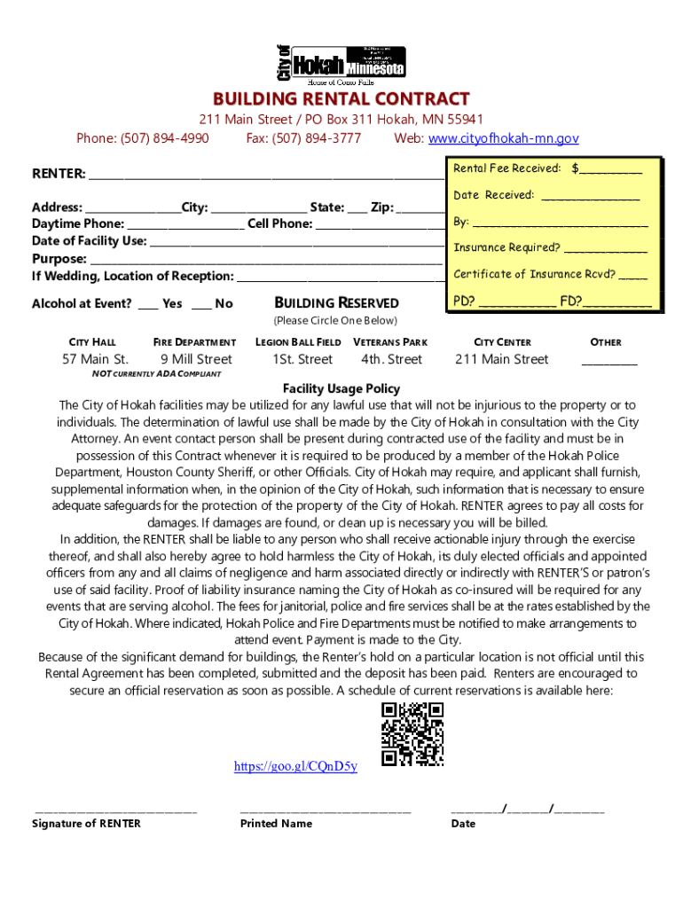 BUILDING RENTAL CONTRACT211 Main Street / PO Box 311 Hookah, MN 55941 Phone: (507× 8944990 Fax: (507× 8943777 Web: www.cityofhokahmn.gov RENTER: ___ Rental Fee Received: $___ Date Received: ___Address:
