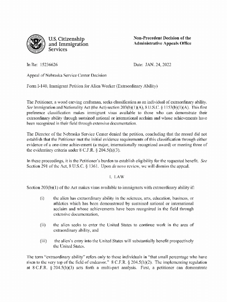 Precedent Decision of the Administrative Appeals Office. S. Citizenship and Immigration Services In Re: 15236626Date: JAN. 24, 2022Appeal of Nebraska Service Center Decision Form 1140, Immigrant Petition