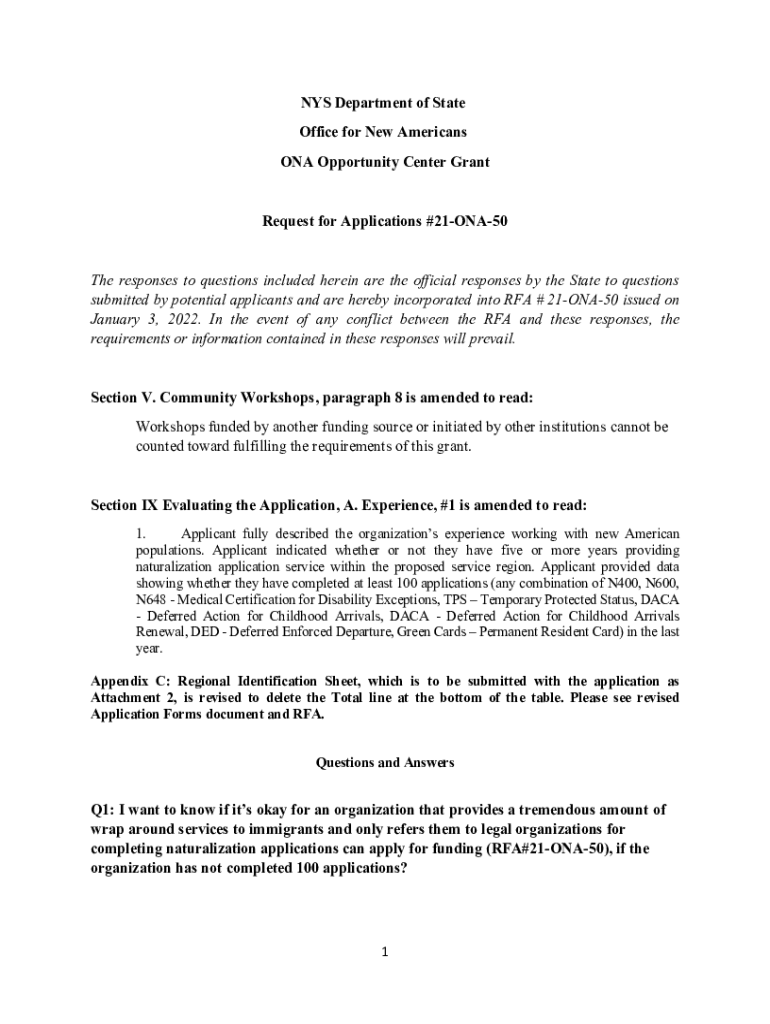 NYS Department of State Office for New Americans ON Opportunity Center Grant Request for Applications #21ONA50 The responses to questions included herein are the official responses by the State to
