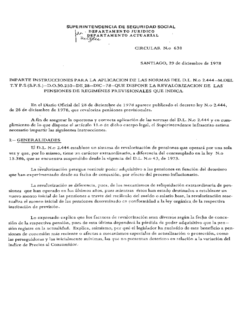 SUPERINTENDENCE DE SCIURIDAE SOCIAL. DEPARTMENT JURIDIC DEPARTMENT ACTUARIAL\'kc.CIRCULAR N.o 638SANTIAGO, 29 de December de 1978IMPARTE INSTRUCTIONS PARA LA APPLICATION DE LAS NORMAL DEL D.L. N.o
