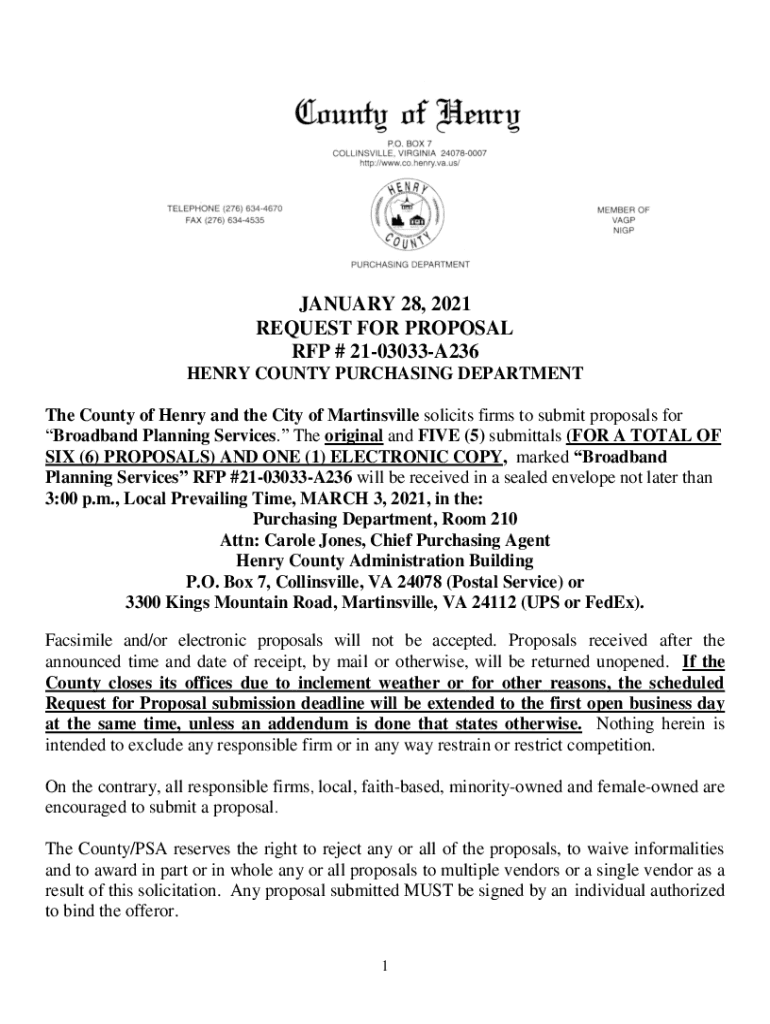 JANUARY 28, 2021, REQUEST FOR PROPOSAL RFP # 2103033A236 HENRY COUNTY PURCHASING DEPARTMENT The County of Henry and the City of Martinsville solicits firms to submit proposals for Broadband Planning