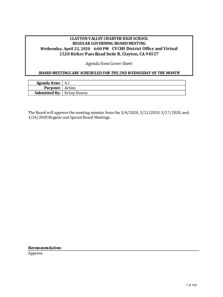 CLAYTON VALLEY CHARTER HIGH SCHOOL REGULAR GOVERNING BOARD MEETING Wednesday, April 22, 2020 6:00 PM CV CHS District Office and Virtual1520 Kicker Pass Road Suite B, Clayton, CA 94517 Agenda Item