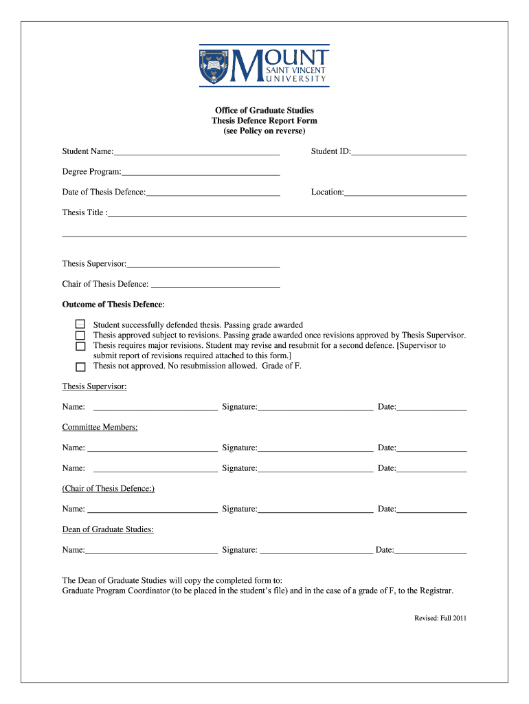 Office of Graduate Studies Thesis Defense Report Form (see Policy on reverse) Student Name: Student ID: Degree Program: Date of Thesis Defense: Location: Thesis Title : Thesis Supervisor: Chair of