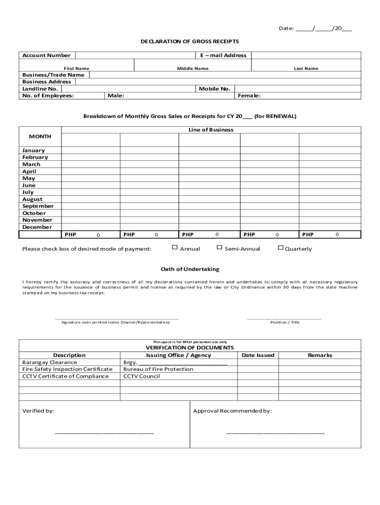 Date: ___/___/20___ DECLARATION OF GROSS RECEIPTS Account Number Email AddressFirst NameMiddle NameBusiness×Trade Name Business Address Landline No. No. of Employees:Last Name Mobile No. Male:Female:Breakdown