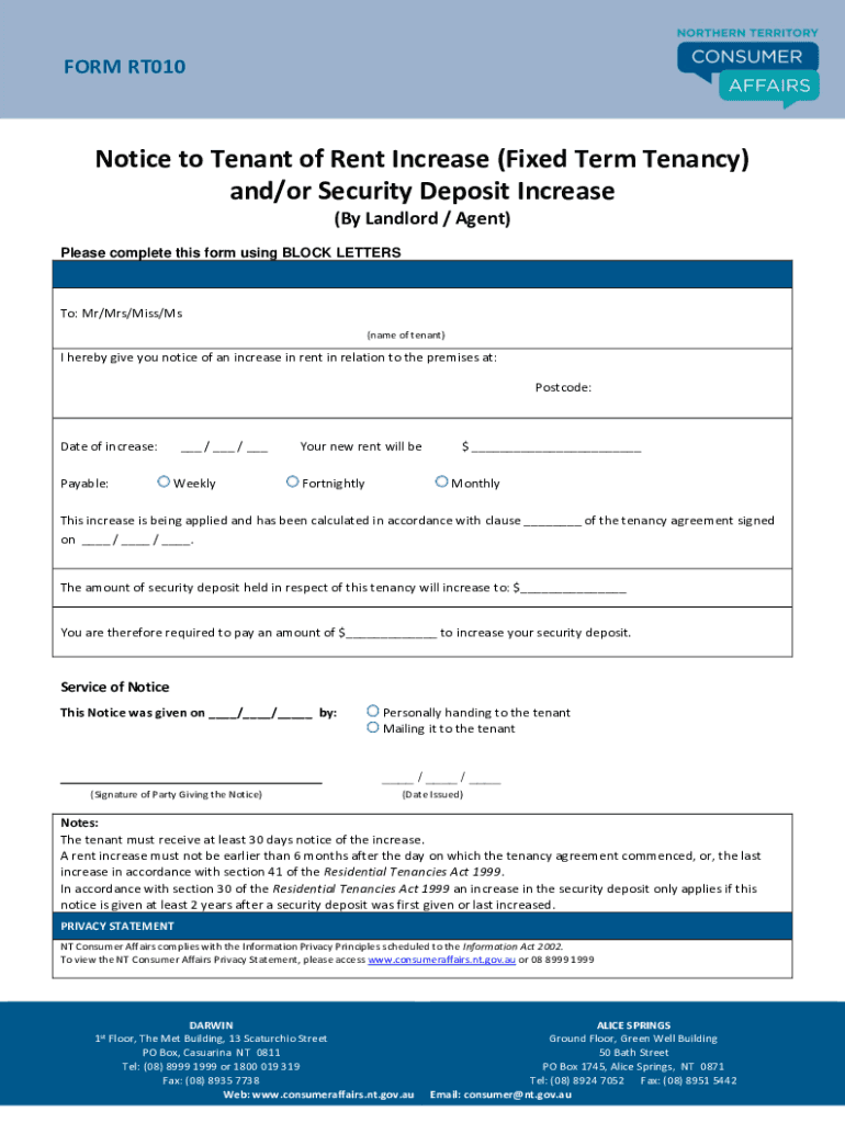 FORM RT010Notice to Tenant of Rent Increase (Fixed Term Tenancy) and×or Security Deposit Increase (By Landlord / Agent) Please complete this form using BLOCK Letters: Mr×Mrs×Miss×Ms (name of tenant×I