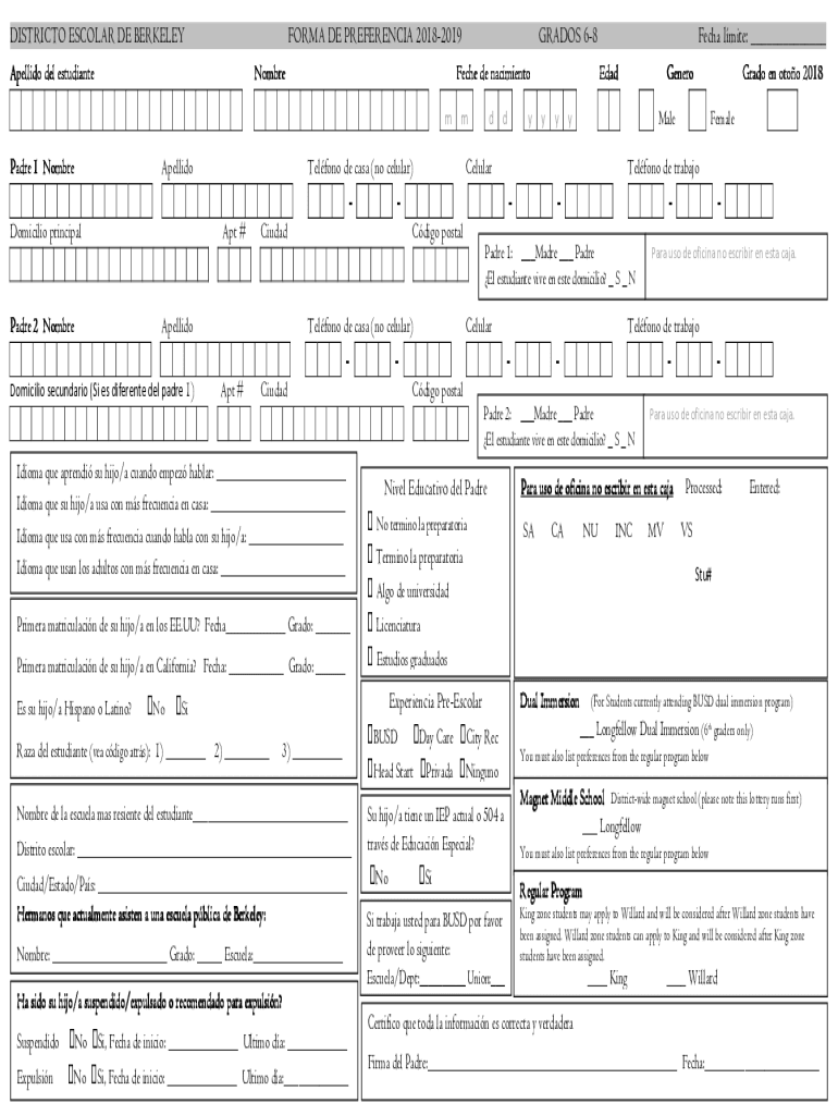 DISTRICT ESCOLAR DE BERKELEYFORMA DE PREFERENCE 20182019Apellido Del estudianteNombre NombreGRADOS 68Feche de Nascimento mm Padre 1 NombreApellidoTelfono de Casey (no cellular×Domicile principal