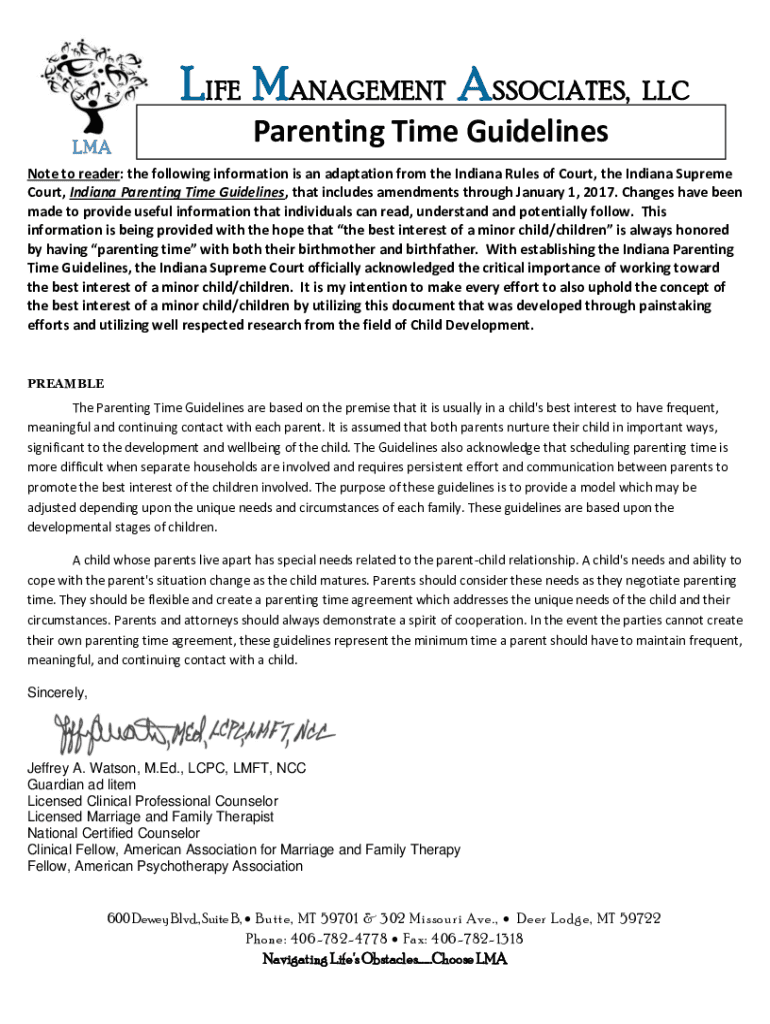 L IF M MANAGEMENT A ASSOCIATES, LLC Parenting Time GuidelinesNote to reader: the following information is an adaptation from the Indiana Rules of Court, the Indiana Supreme Court, Indiana Parenting