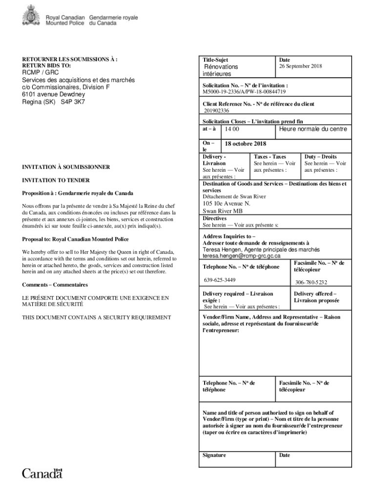 RETURNER LES COMMISSIONS : RETURN BIDS TO:TitleSujetRCMP / GRC Services DES acquisitions et DES marches c×o Commissionaires, Division F 6101 avenue Dewey Regina (SK) S4P 3K7Solicitation No. N de