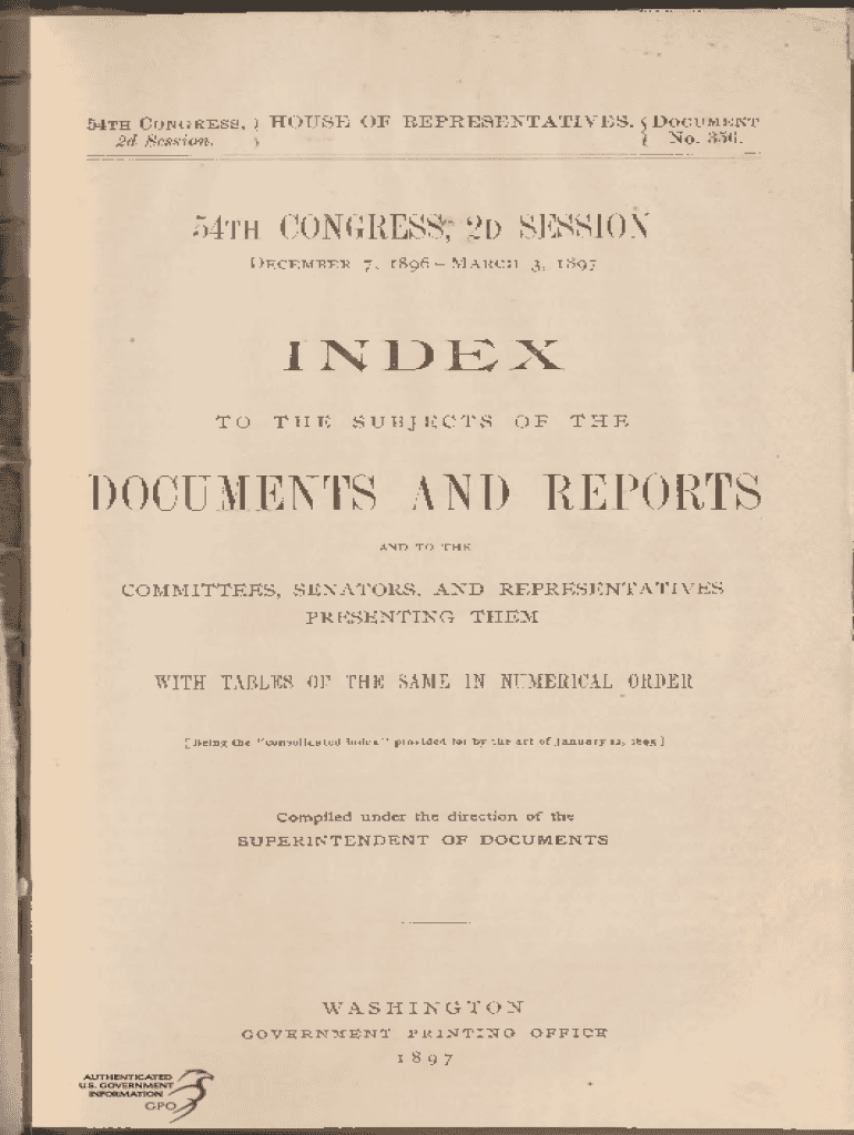 54th Cong res s, ) HOUSE OF REPRESENTATIVES. 5 Document No. 356. 2d Session. S54th CONGRESS; 2d SESSION December7, 1896March3, 1897INDEX TO THE SUBJECTS OF DOCUMENTS AND REPORTS AND TO COMMITTEES,