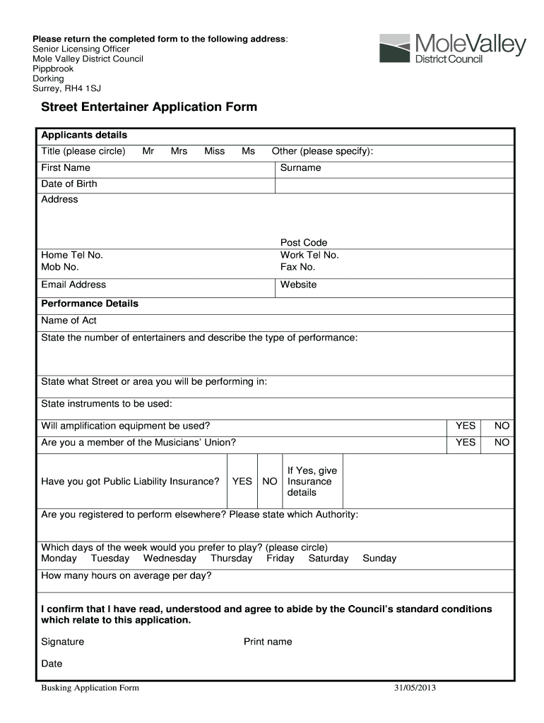 Please return the completed form to the following address: Senior Licensing Officer Mole Valley District Council Pippbrook Working Surrey, RH4 1SJ Street Entertainer Application Form Applicants details