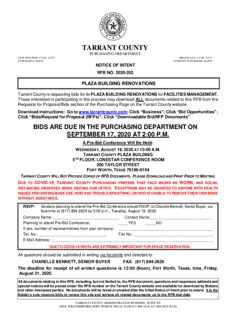 TARRANT COUNTY PURCHASING DEPARTMENT JACK BEA CHAM, C.P.M., A.P.P. PURCHASING AGENTMELISSA LEE, C.P.M., A.P.P. ASSISTANT PURCHASING AGENTNOTICE OF INTENT ROB NO. 2020202PLAZA BUILDING RENOVATIONS