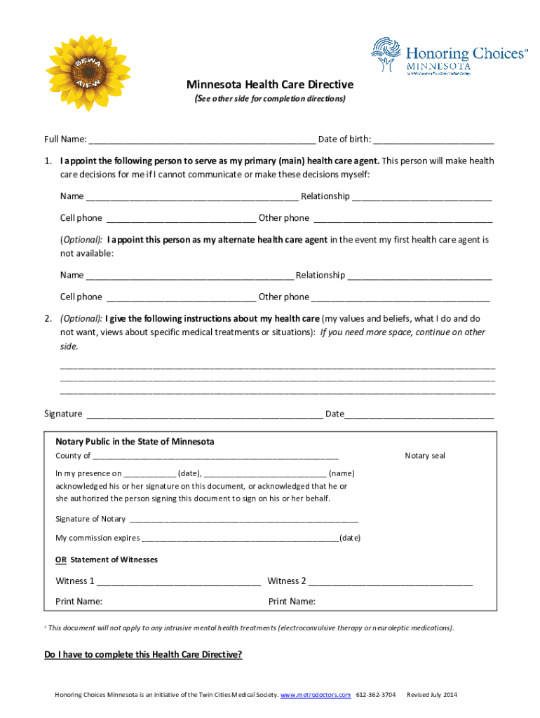 Minnesota Health Care Directive (See other side for completion directions×Full Name: ___ Date of birth: ___ 1. I appoint the following person to serve as my primary (main) health care agent. This