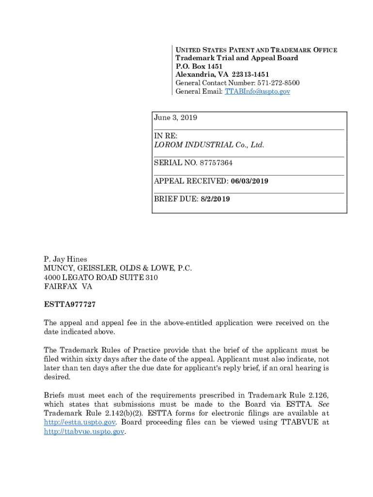 UNITED STATES PATENT AND TRADEMARK OFFICE Trademark Trial and Appeal Board P.O. Box 1451 Alexandria, VA 223131451 General Contact Number: 5712728500 General Email: Fabinho×USPTO.gov June 3, 2019