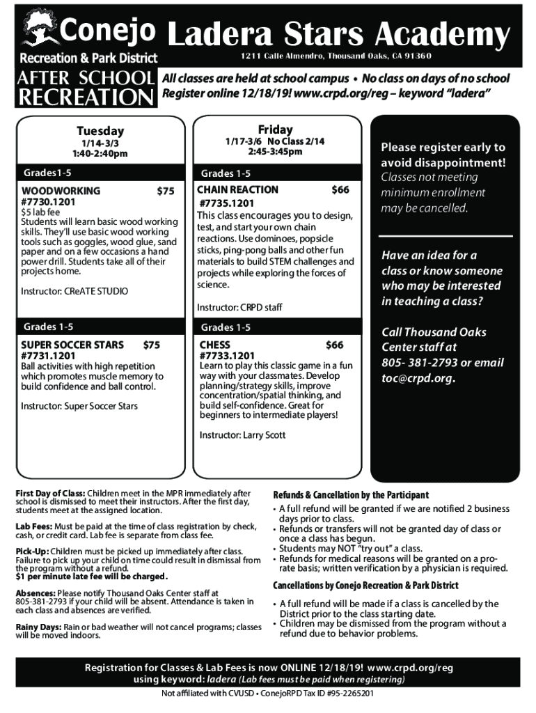 Madera Stars Academy 1211 Called Amended, Thousand Oaks, CA 91360AFTER Schools classes are held at school campus No class on days of no school Register online 12×18/19! www.crpd.org×reg keyword