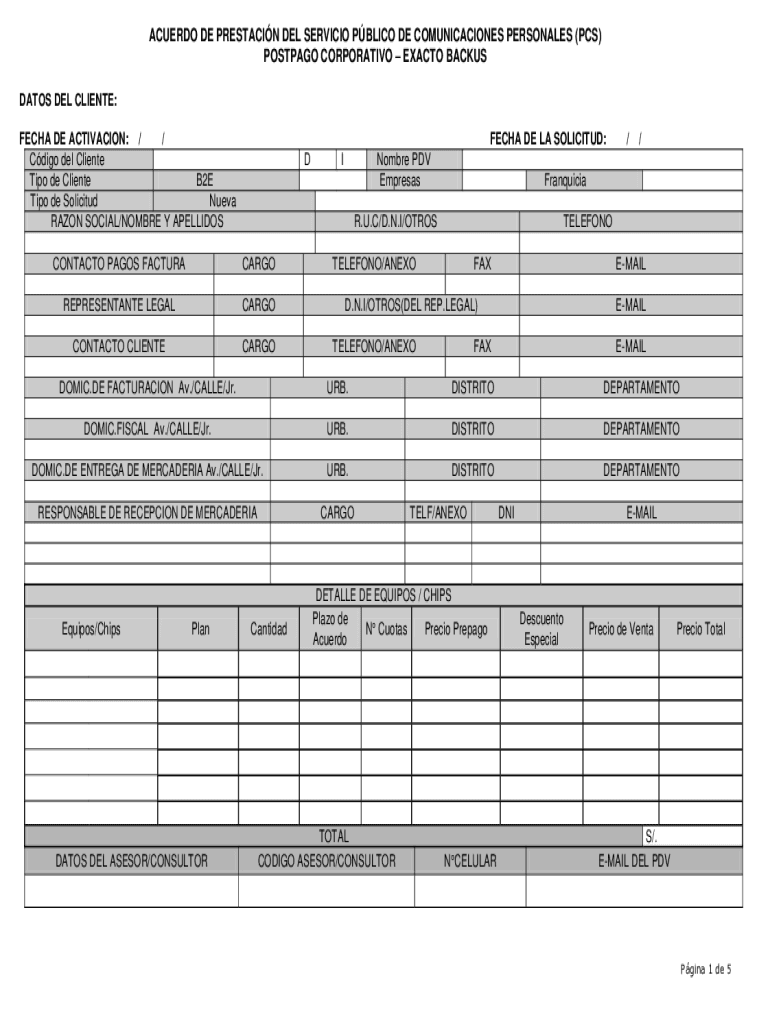 ACTED DE PRESTATING DEL SERVICE PBL ICO DE COMMUNICATIONS PERSONAGES (PCS) POSTAGE CORPORATION EXACT BACKUS DATES DEL CLIENT: FEC HA DE ACTIVATION: / / Cargo Del Client Tip ode Client B2E Tip ode