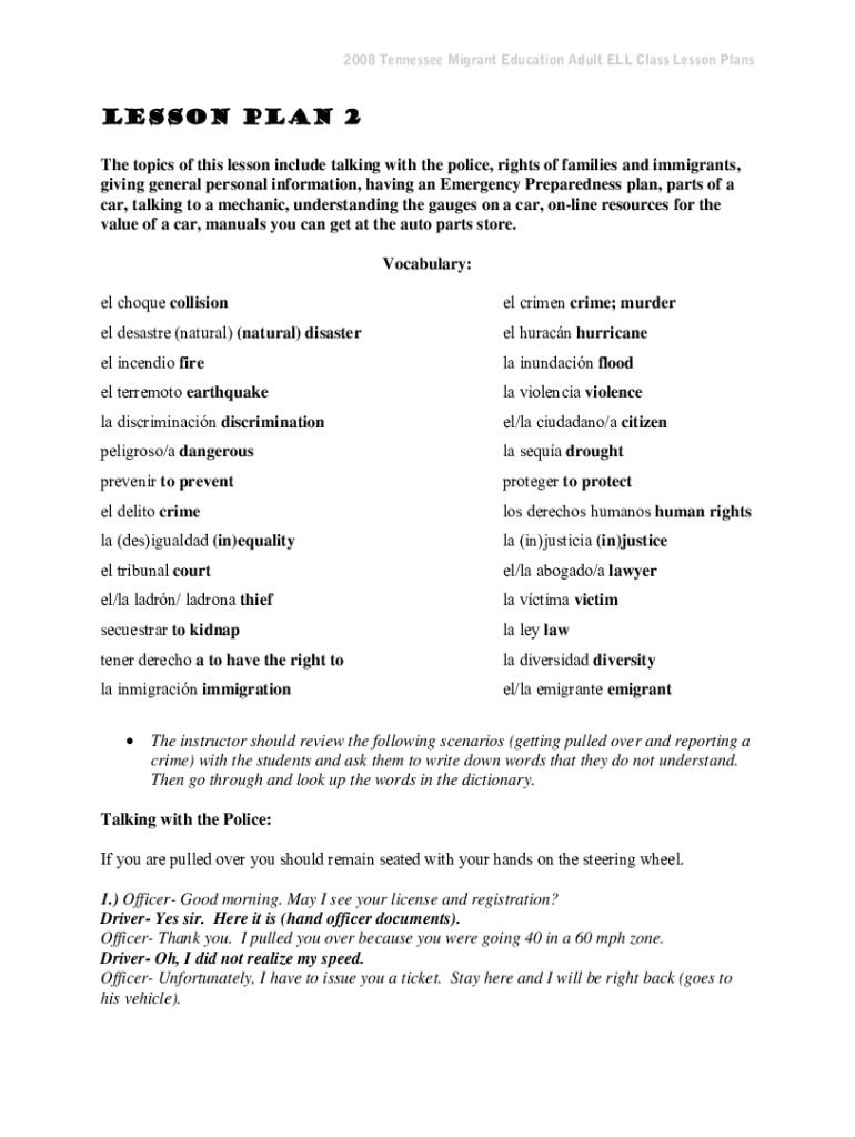 2008 Tennessee Migrant Education Adult ELL Class Lesson PlansLesson Plan 2 The topics of this lesson include talking with the police, rights of families and immigrants, giving general personal information,