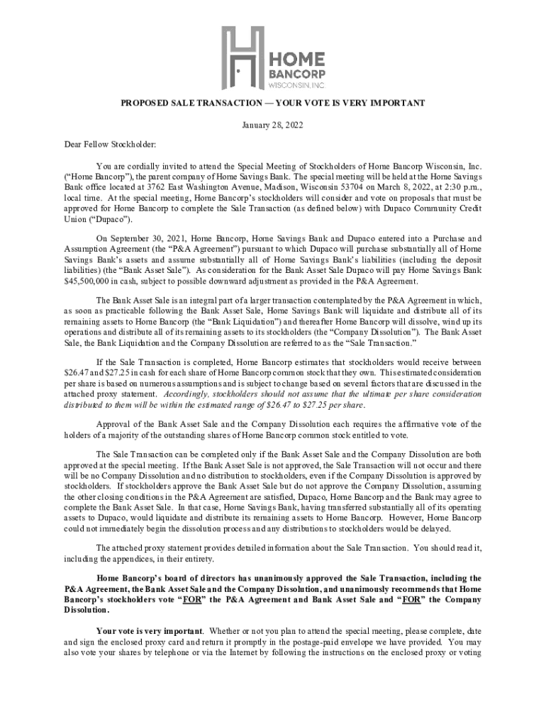 PROPOSED SALE TRANSACTION YOUR VOTE IS VERY IMPORTANT January 28, 2022, Dear Fellow Stockholder: You are cordially invited to attend the Special Meeting of Stockholders of Home Ban corp Wisconsin,
