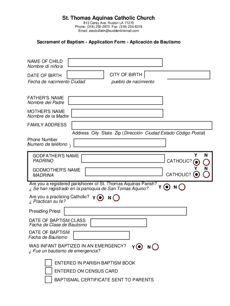 St. Thomas Aquinas Catholic Church 813 Carey Ave. Huston LA 71270 Phone: (318× 2552870 Fax: (318× 2548319 Email: stacbulletin×suddenlinkmail.compartment of Baptism Application Form Application