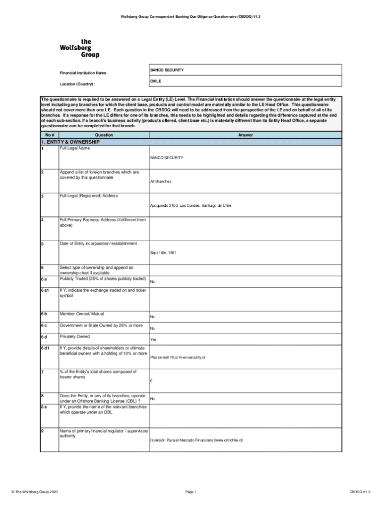Wolves berg Group Correspondent Banking Due Diligence Questionnaire (BDD) V1.3Financial Institution Name: Location (Country) :BANCO SECURITY Chinese questionnaire is required to be answered on a Legal