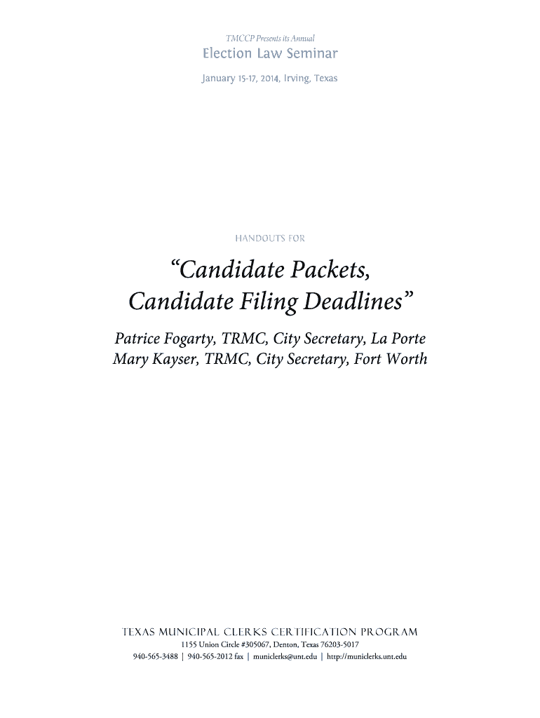 TM CCP Presents its Annual Election Law Seminar January 1517, 2014, Irving, Texas HANDOUTS FOR Candidate Packets, Candidate Filing Deadlines Patrice Fog arty, RMC, City Secretary, La Port Mary Kaiser,