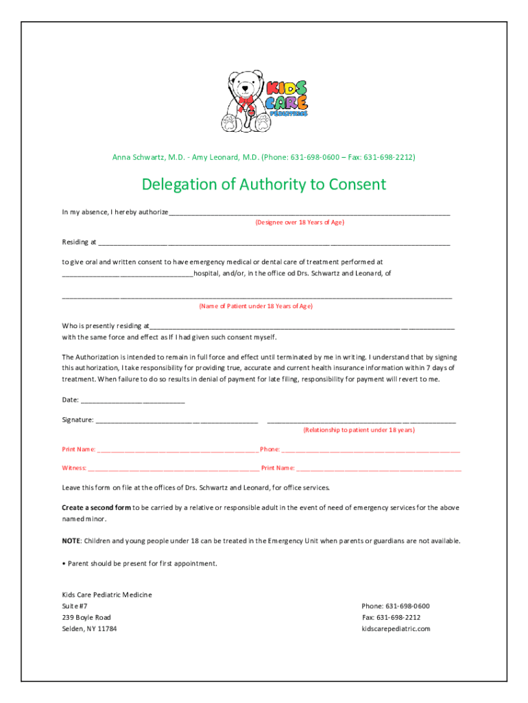 Anna Schwartz, M.D. Amy Leonard, M.D. (Phone: 6316980600 Fax: 6316982212×Delegation of Authority to Consent In my absence, I hereby authorize___ (Designee over 18 Years of Age×Residing at ___ to