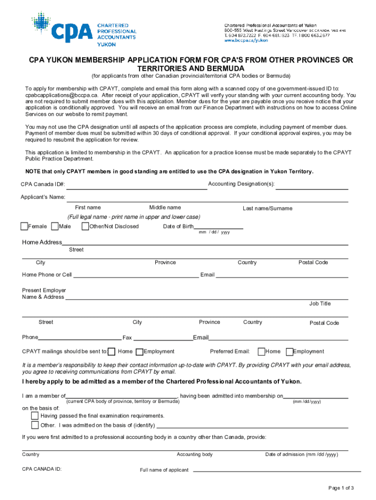 CPA YUKON MEMBERSHIP APPLICATION FORM FOR CPA\'S FROM OTHER PROVINCES OR TERRITORIES AND BERMUDA (for applicants from other Canadian provincial×territorial CPA bodies or Bermuda×To apply for membership