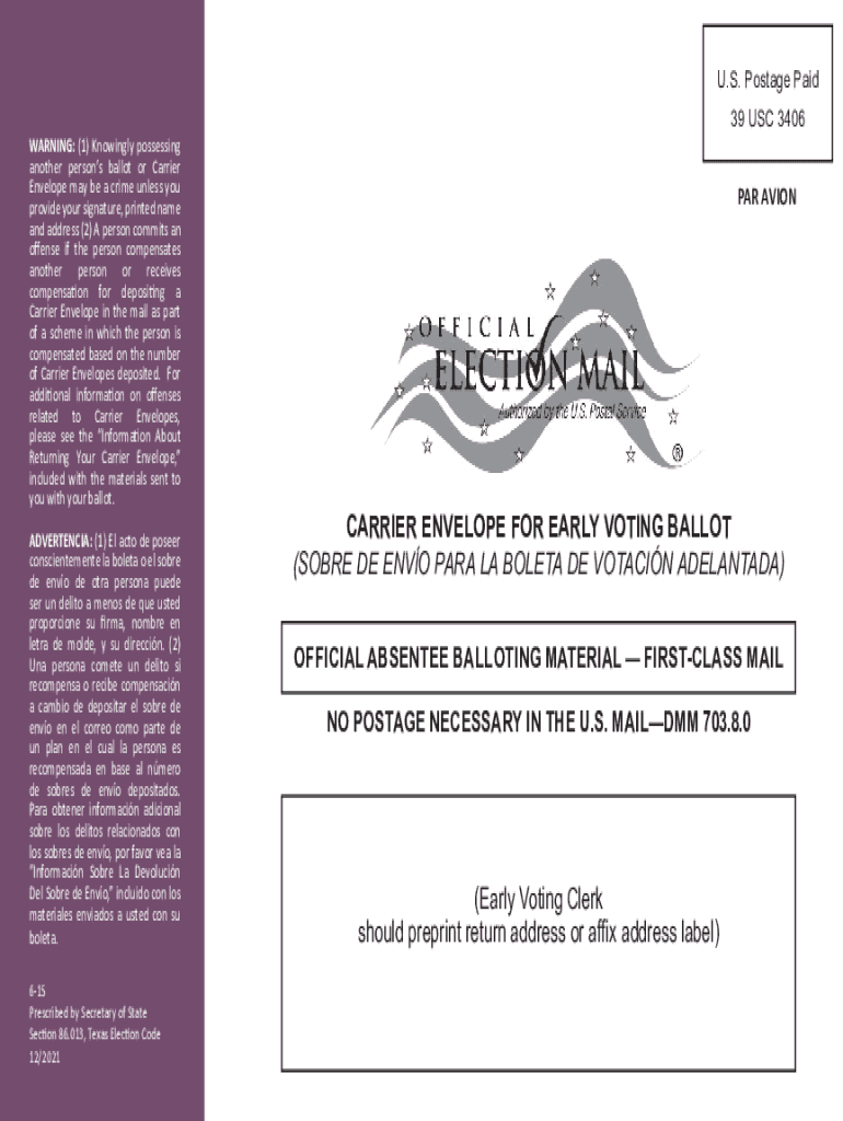U.S. Postage Paid WARNING: (1) Knowingly possessing another persons ballot or Carrier Envelope may be a crime unless you provide your signature, printed name and address (2× A person commits an offense