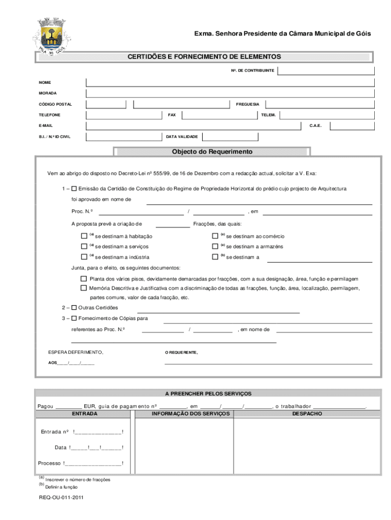 Exam. Señora President the Clara Municipal de GisCERTIDES E FORNECIMENTO DE ELEMENTS N. DE CONTRIBUTE NOME MORAL CDI GO POSTALFREGUESIATELEFONEFAXTELEM.EMAIL. A.E.B.I. × N. ID CIVILIAN VALIDADEObjecto
