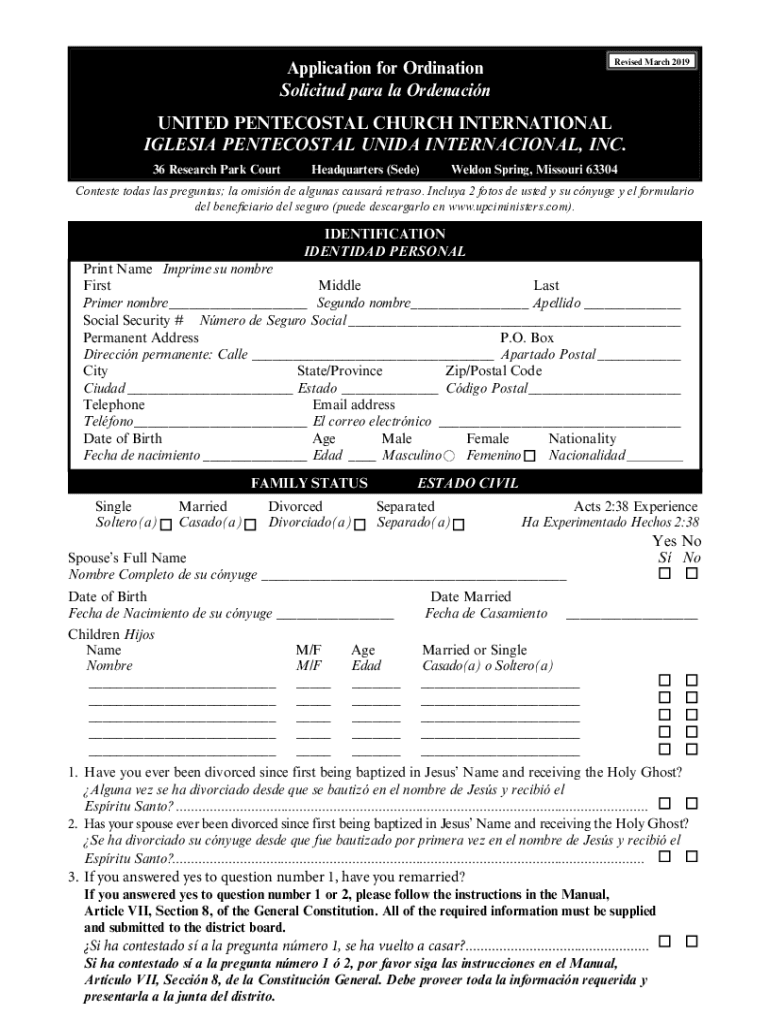 Revised March 2019Application for Ordination Solicited para la OrdenacinUNITED PENTECOSTAL CHURCH INTERNATIONAL IGLESIAS PENTECOSTAL UNIDO INTERNATIONAL, INC. 36 Research Park CourtHeadquarters (See×Weldon