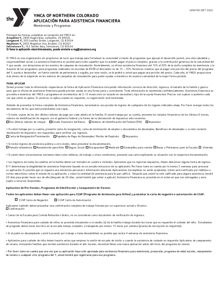 UPDATED SEPT 2020YMCA OF NORTHERN COLORADO APPLICATION PARA ASISTENCIA FINANCIER Members y ProgramasEntregue leis format completes en reception Del YMCA en: Arapahoe Y, 2800 Deign Way, Lafayette,
