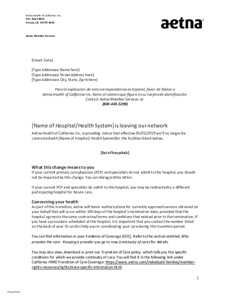 Aetna Health of California Inc. P.O. Box 24019 Fresno, CA 937794019Aetna Member Services×Insert Date] [Type Addressee Name here] [Type Addressee Street Address here] [Type Addressee City, State,