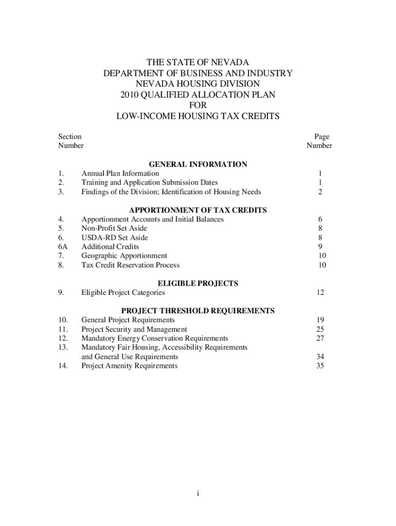 THE STATE OF NEVADA DEPARTMENT OF BUSINESS AND INDUSTRY NEVADA HOUSING DIVISION 2010 QUALIFIED ALLOCATION PLAN FOR INCOME HOUSING TAX CREDITS Section Number Page Number1. 2. 3.GENERAL INFORMATION