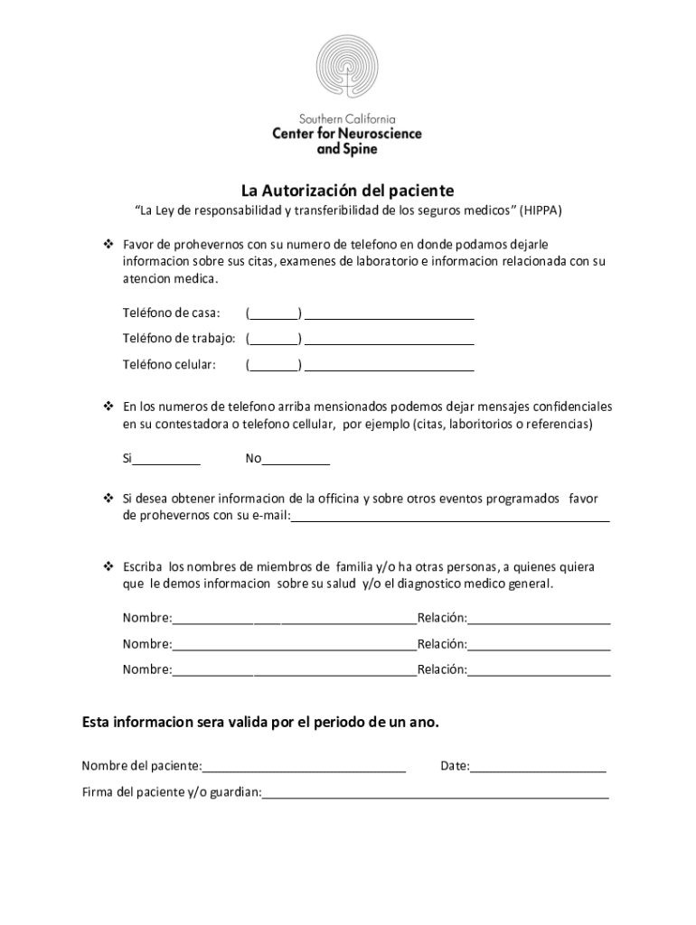 La Authorization Del patients La La de responsabilidad y transferibilidad de Los euros medicos (HIPPO) Favor de prohevernos con SU number DE telephone en done pedalos Earle information sober SUS cites,