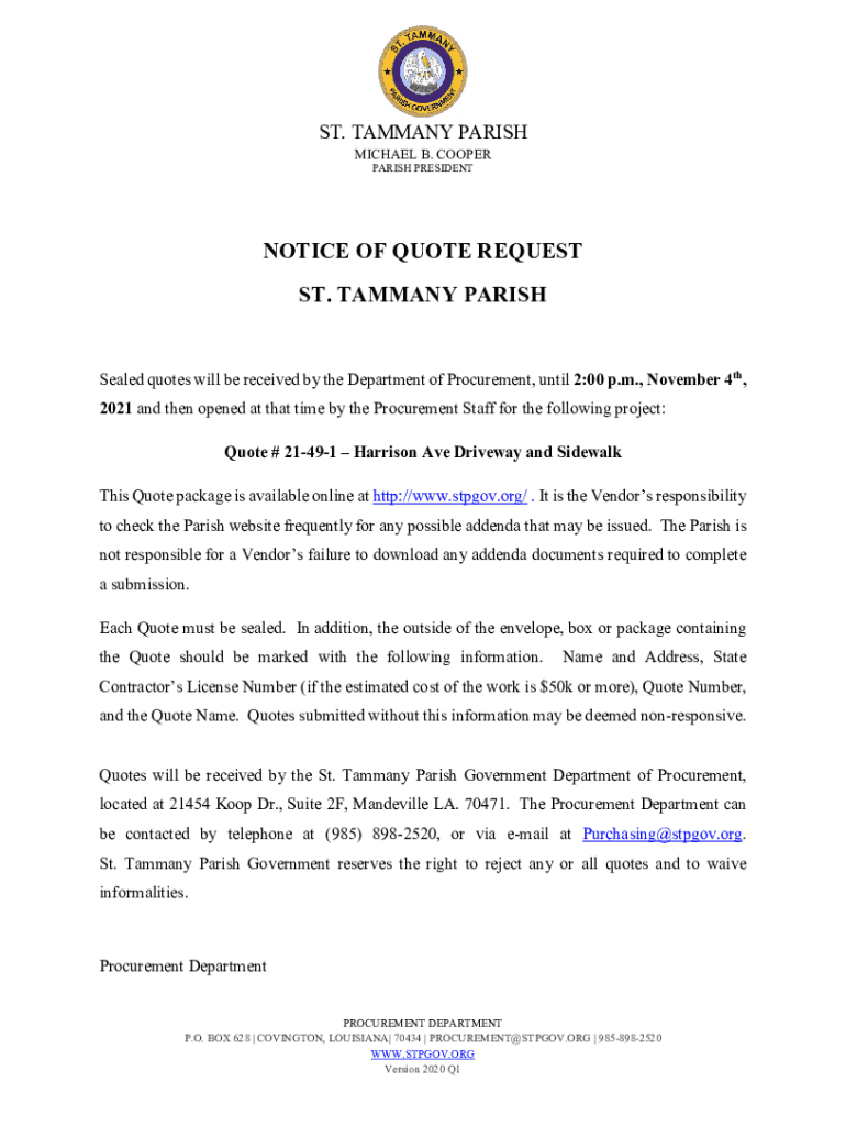 ST. TAMMANY PARISH MICHAEL B. COOPER PARISH PRESIDENTNOTICE OF QUOTE REQUEST ST. TAMMANY PARISHSealed quotes will be received by the Department of Procurement, until 2:00 p.m., November 4th, 2021