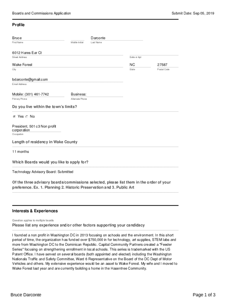 Boards and Commissions ApplicationSubmit Date: Sep 05, 2019Profile BruceDarconteFirst NameMiddle Initially Name6012 Hares Ear Ct Street AddressSuite or Apt Wake ForestNC27587CityStatePostal Codebdarconte×gmail.com