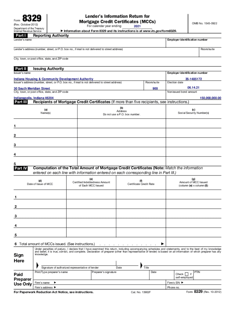 8329Lender\'s Information Return for Mortgage Credit Certificates (CCS×Form (Rev. October 2012) Department of the Treasury Internal Revenue Serviceman BOMB No. 15450922For calendar year ending2021