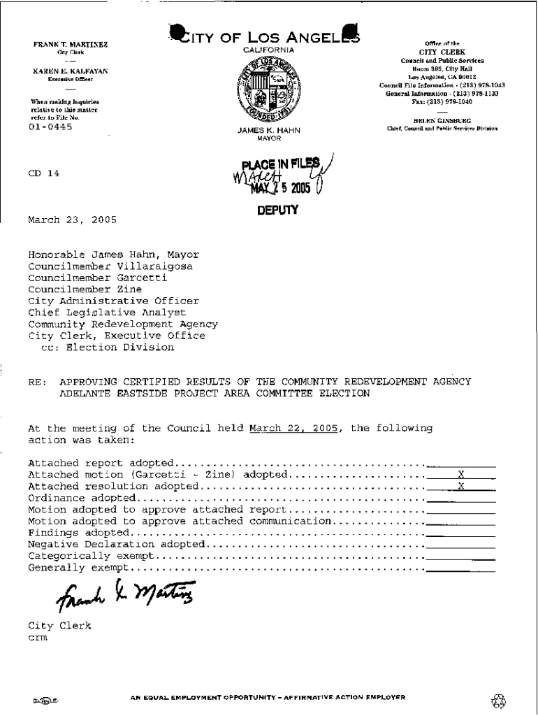 FRANK T. MARTINEZ OF LOS ANGEL. Office of theCALIFORNIACity Clarity CLERK Council and Public Services Room 395, City Hall Los Angeles, CA 90012 Council File Information (213× 9781043 General Information
