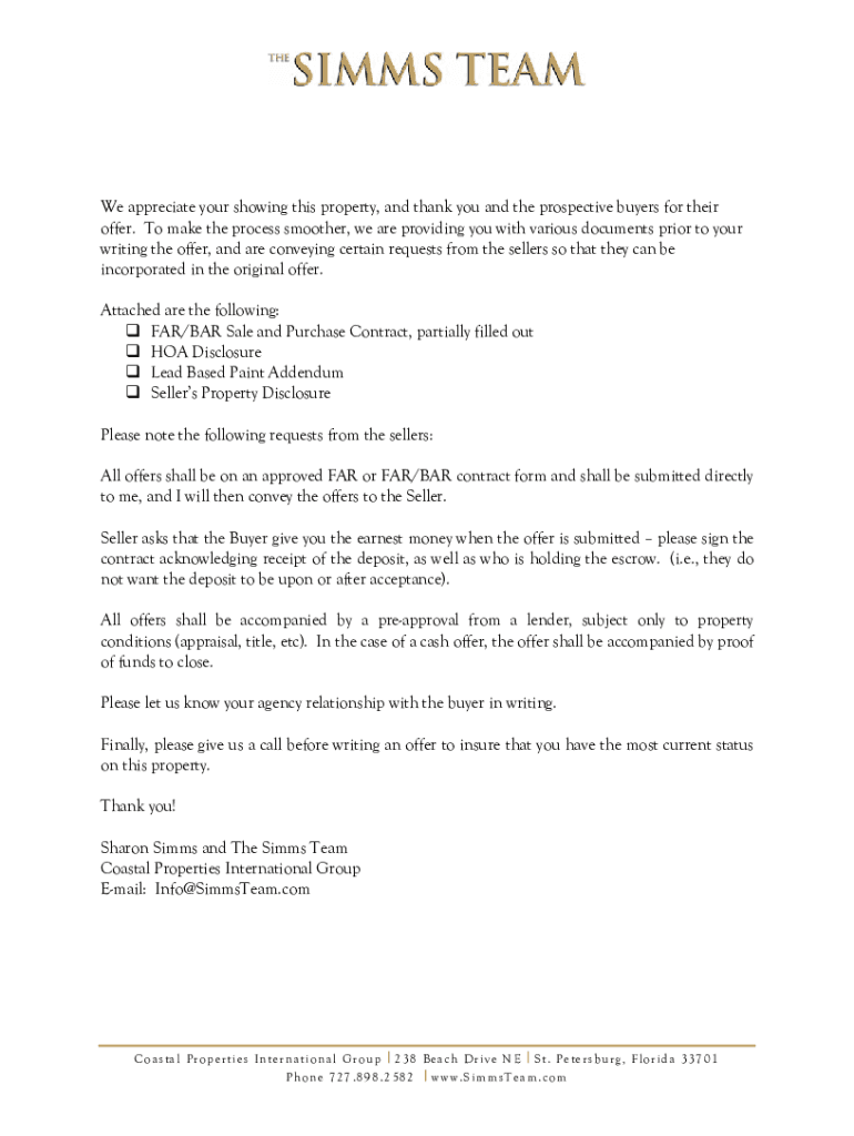 We appreciate your showing this property, and thank you and the prospective buyers for their offer. To make the process smoother, we are providing you with various documents prior to your writing