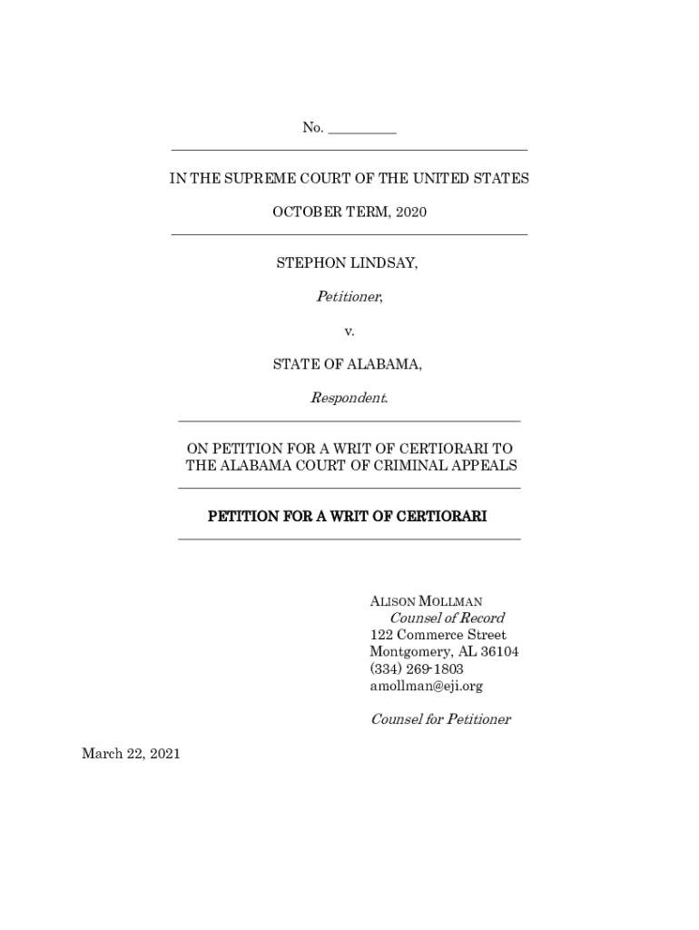 No. ___ ___ IN THE SUPREME COURT OF THE UNITED STATES OCTOBER TERM, 2020 ___ STEPHEN LINDSAY, Petitioner, v. STATE OF ALABAMA, Respondent.___ ON PETITION FOR A WRIT OF CERTIORARI TO THE ALABAMA COURT