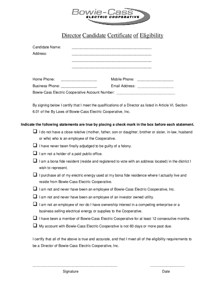 Director Candidate Certificate of Eligibility Candidate Name:___Address:___ ___ ___Home Phone:___Mobile Phone: ___Business Phone: ___Email Address: ___Bowheads Electric Cooperative Account Number: